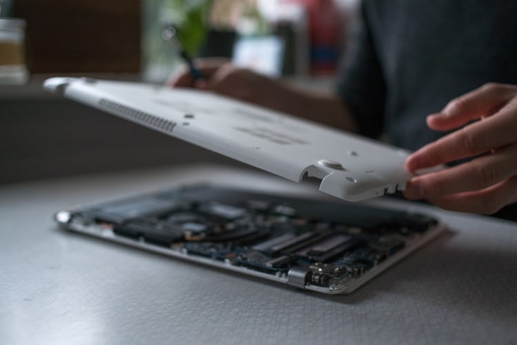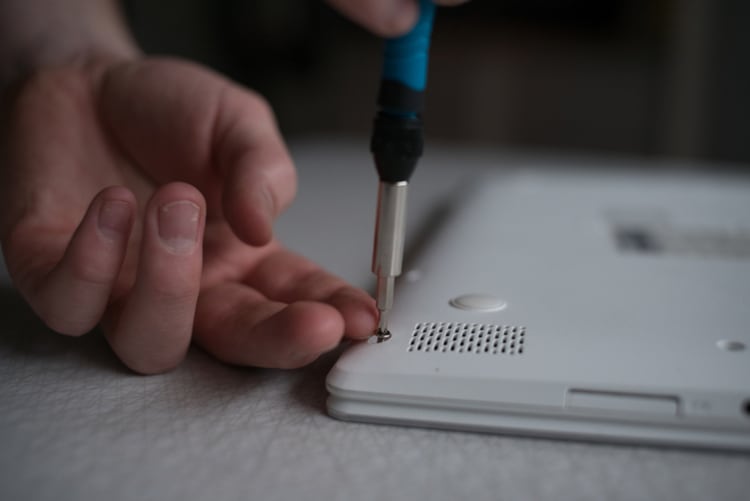 De flesta bärbara datorer behöver en stjärnskruvmejsel för att öppna datorn. Har du Mac behöver du dock en mindre skruvmejsel, en så kallad Philips 00. Tänk på att hålla koll på skruvarna – de är små och kan lätt försvinna. Lägg datorn upp och ned och börja skruva upp skruvarna.