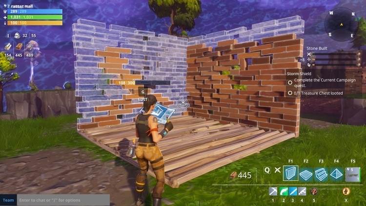 - Du kan samla trä, sten och metall, som du kan bygga olika väggar av. Trä går snabbast att bygga med, och tål mest på kort sikt, medan väggar av mur och metall är starkast över tid. Ska du bygga dig skydd eller en trappa för att komma undan från fienden, bör du alltid bygga i trä.