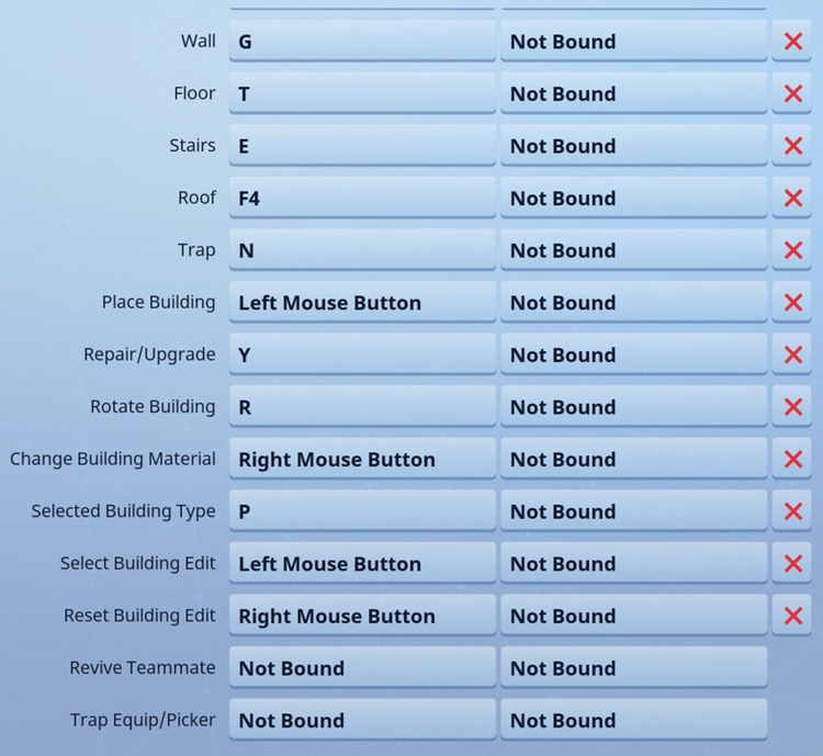 - Standard är att bygg-funktionerna ligger på F1, F2, F3 OCH F4, men det är väldigt onaturligt för mig. I likhet med ”mouse sensitivity”, menar jag att det är smart att inte byta dessa knappar. Ta reda på vad som är naturligt för dig och håll dig till de inställningarna.