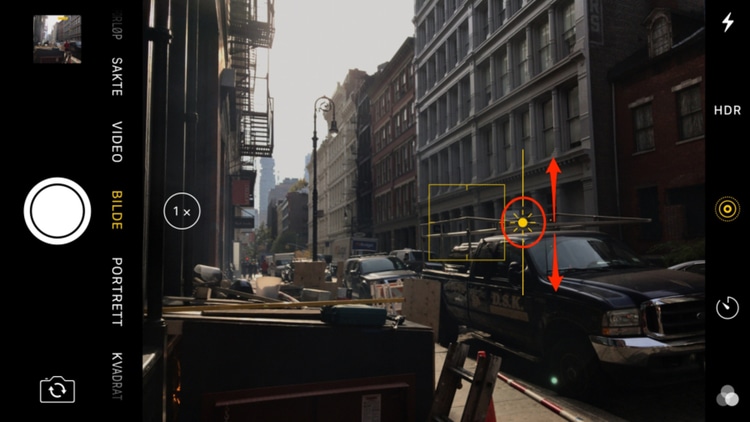 JUSTERA LJUSET: Innan du tar en bild, kan du bestämma om du vill ha mer eller mindre ljus genom att trycka på solsymbolen. FOTO: SKÄRMDUMP IPHONE