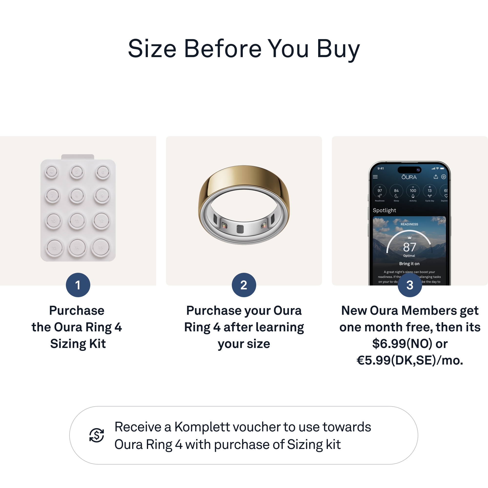 Eftersom Oura-ringarna inte följer standardstorlekar är det avgörande att du i förväg mäter vilken storlek som passar just dig. Detta gör du genom att beställa Oura Ring 4 storleksset innan du köper din nya Oura-ring. Eftersom fingrarna kan variera i storlek vid olika tidpunkter på dagen rekommenderas det att du använder storleksringen i minst 24 timmar. Du kommer att få en värdecheck motsvarande priset för storlekssetet när du beställer.