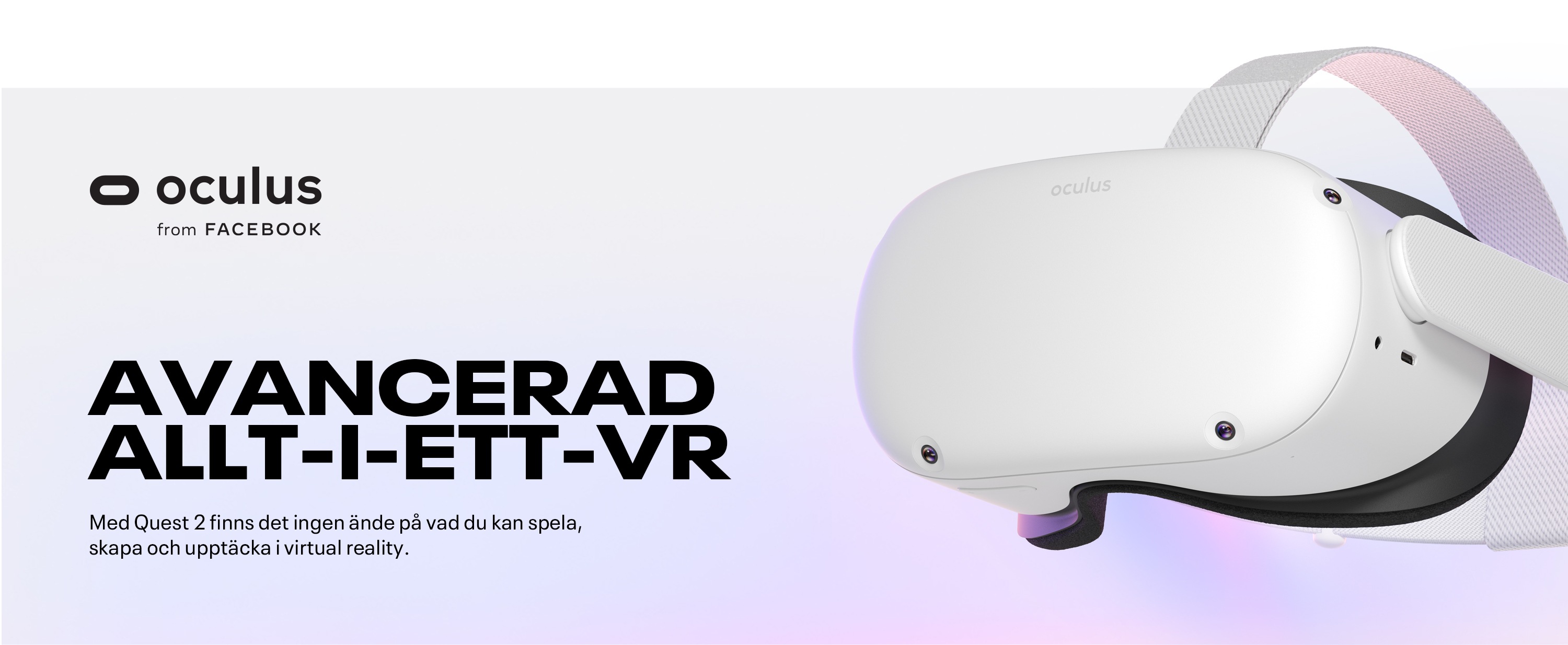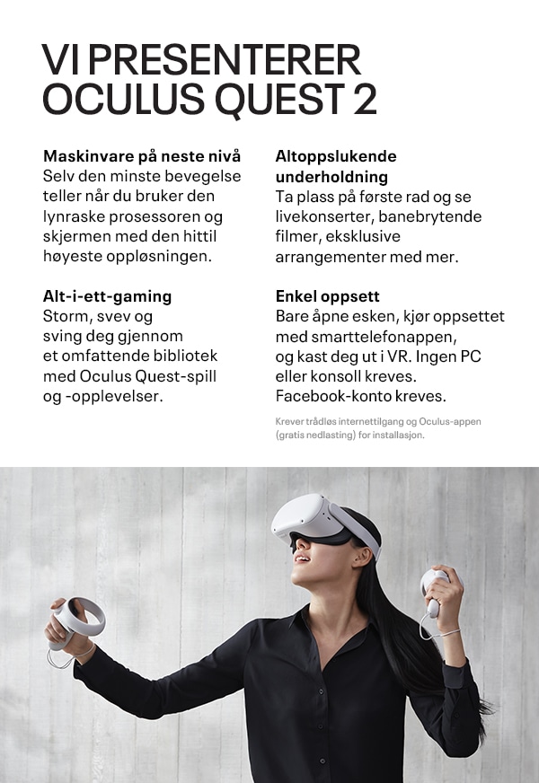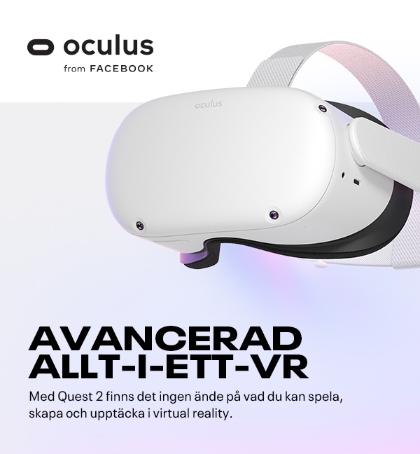 Få två spännande spel när du köper Meta Quest 2. Gäller t.o.m. 2023-06-03. Villkor gäller. Meta Quest 2 är allt-i-ett-system som verkligen gör dig fri att vandra runt i VR utan sladdar eller kablar som begränsar din upplevelse. Med en supersnabb processor och högupplöst skärm förblir din upplevelse smidig och sömlös, även i högfartsäventyr. 3D-positionerat ljud, handspårning och taktil feedback får de virtuella världarna att kännas verkliga. Det inbyggda batteriet gör att du kan utforska mer och längre när du upptäcker ett växande bibliotek med över 350 titlar inom spel, socialt/flera spelare, träning och underhållning. Ta steget in i otroliga sociala platser och arenor för flera spelare med människor från jorden runt för att träffas, spela och bygga communities. Res genom universum och i storsäljande fantasiberättelser. Bli vettlöst rädd i fasansfulla äventyr eller samarbeta med kollegor på innovativa arbetsplatser. Sitt på första plats på filmer och live-evenemang med vänner och familj. Hitta ditt nya träningsgäng eller ge dig ut på uppdrag med andra äventyrare. Och du får tillgång till över 1 000 titlar i Rift-biblioteket genom att ansluta ditt VR-headset till en spelkompatibel dator (dator och kablar säljs separat). Släpp in vänner och familj i din VR-värld genom att casta din upplevelse till kompatibla TV-apparater och andra skärmar. Och vart du än går i den verkliga världen kan du ta med dig ditt lätta, bärbara Quest 2.* Endast från 13 år.