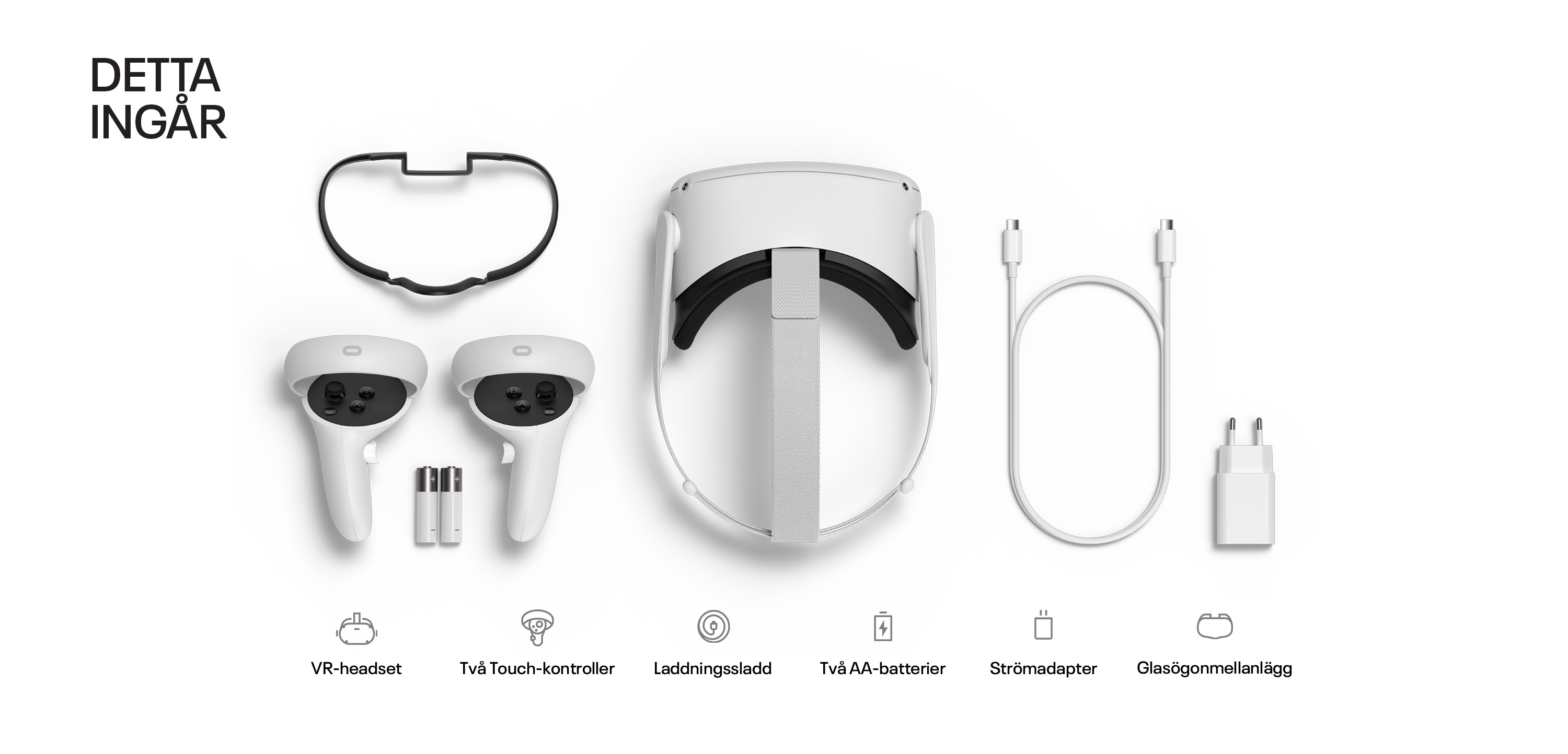 Översikt över vad som medföljer Meta Quest 2: VR-hörlurar, två touchkontroller, laddkabel, två AA-batterier, strömadapter, silikonskydd och distans till glasögon.