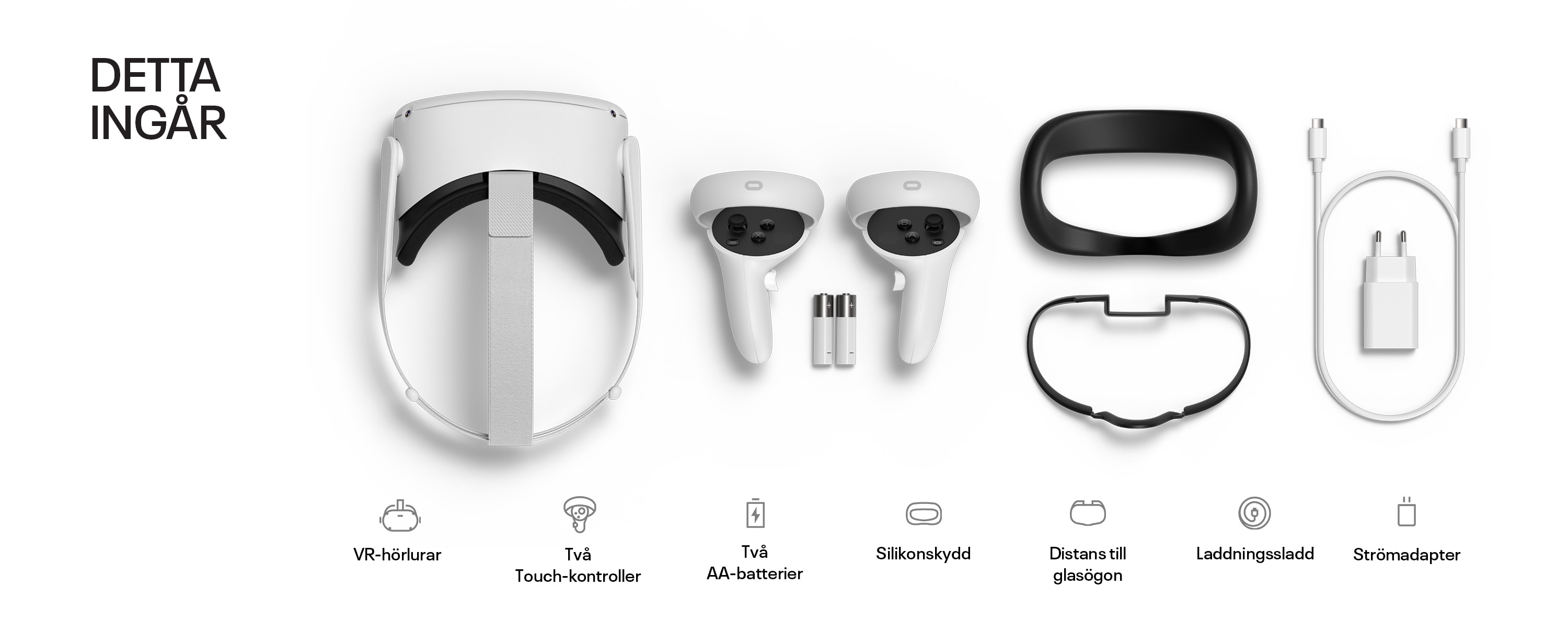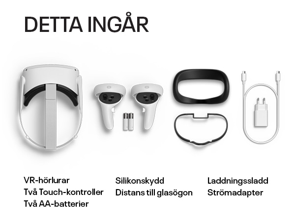 Översikt över vad som medföljer Meta Quest 2: VR-hörlurar, två touchkontroller, laddkabel, två AA-batterier, strömadapter, silikonskydd och distans till glasögon.