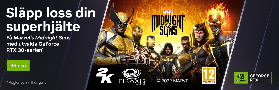 I alla Komplett-PC med ett GeForce RTX 30-serie kort som du ser i listan här över, ingår också Marvel's Midnight Suns