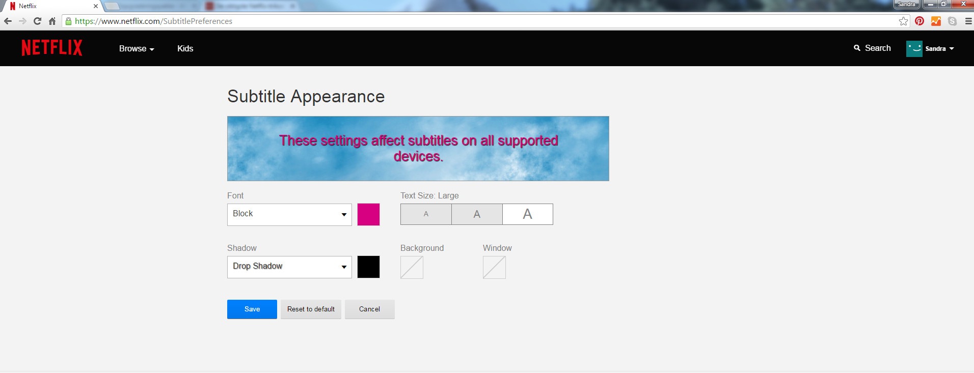 ANPASSA UNDERTEXTEN: Om rosa text är något du föredrar, så kan du välja det, eller kan du ändra på fonten eller storleken. FOTO: SKÄRMDUMP NETFLIX.COM