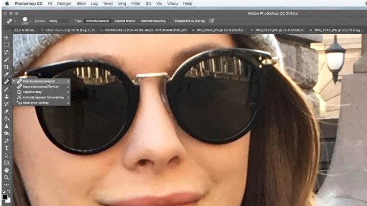 Men om det är något du önskar att retuschera bort, kan du enkelt göra detta genom att välja Punktlagningspenseln i verktygslådan till vänster, välj penselstorlek och klicka på det område du önskar att ta bort. Photoshop kommer att automatiskt korrigera området baserat på omgivningen.