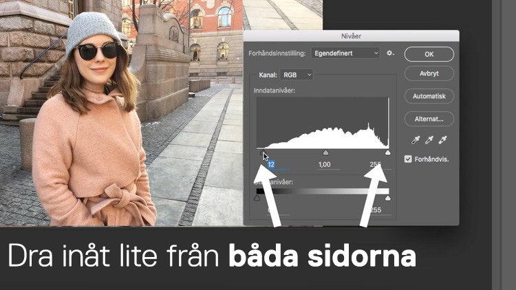 Med skjutreglagen kan du manuellt justera de svarta och vita punkterna i bilden. Du ändrar ljuset och skuggorna i bilden genom att dra ”pilarna” inåt eller utåt. Du kan också testa en av de förinställda funktionerna som finns genom att klicka på panelmenyn Förinställningar, som ligger ovanför histogrammet. Justeringarna ger ofta rätt ljusstyrka i mörka och ljusa partier.