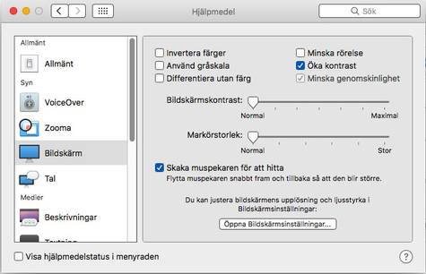 Mac: Systeminställningar > Hjälpmedel > Bildskärm > Klicka i ”Öka kontrast” eller ”Invertera färger”.