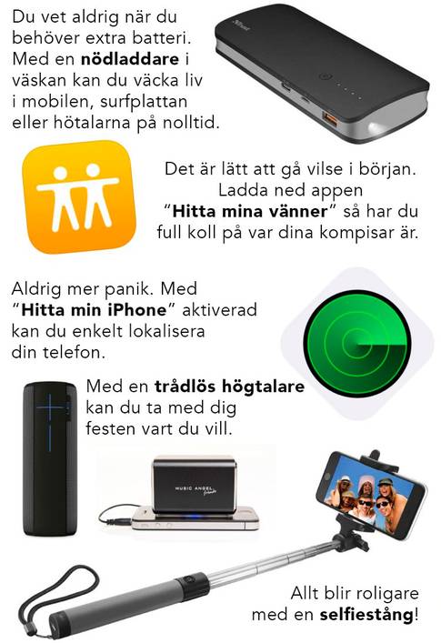 Den kanske allra viktigaste är mobilen, så att du kan ta dina nya vänners telefonnummer, ringa till dem och ta någon rolig bild till dina sociala medier. Men även en nödladdare är bra att ha med sig – så att du kan göra ovanstående även om din telefon har laddat ur.
