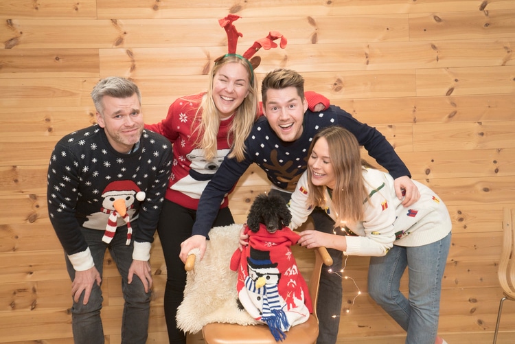 Få tag i några ordentligt "fina" jultröjor och hitta en bra plats att vara på. Kom ihåg att det här är ett julkort och inte ett passfoto så släpp loss kreativiteten.
