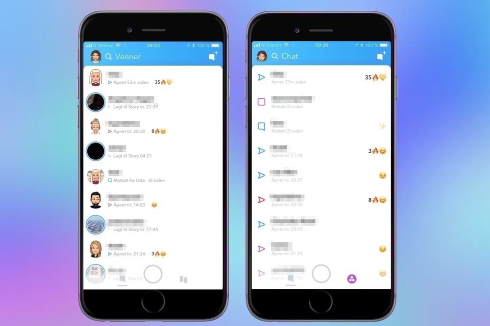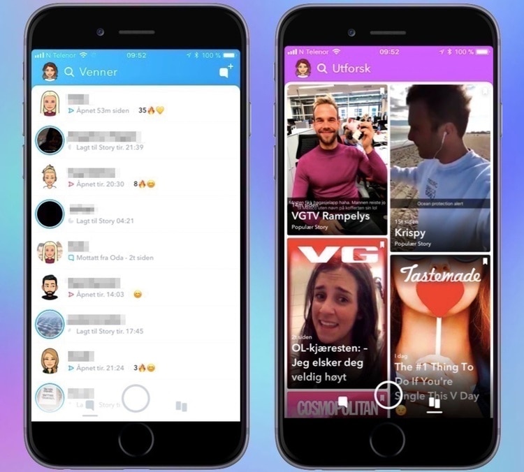 NY OG GAMMEL: Til venstre ser du hvordan nye Snapchat ser ut, og til høyre har du den gamle versjonen. SKJERMDUMP SNAPCHAT