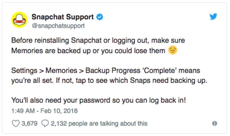 Inställningar (kugghjul-ikonen) Memories > Säkerhetskopiering >Klar. Om det inte står ”klar” kan du klicka vidare för att se vilka snaps som behöver säkerhetskopieras.