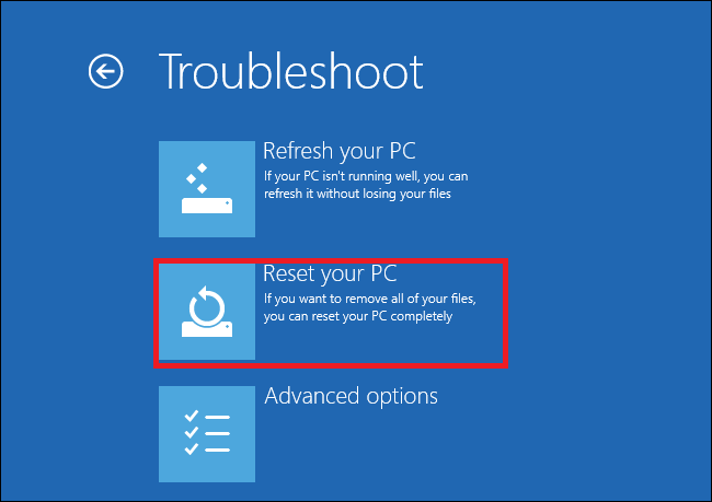 Håll in shift och tryck på Starta om datorn, håll shift nedtryckt tills du kommer in en meny som ser ut som på bilden nedan. Du väljer Troubleshoot, eller felsök om det står på svenska.