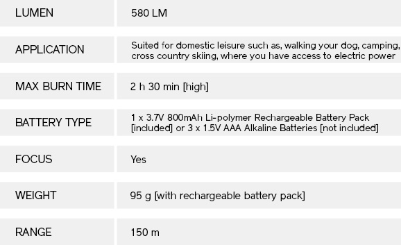 Lampan drivs av det medföljande uppladdningsbara 3,7V 800mAh Li-polymerbatteriet eller 3x1,5 V AAA-batterier - du väljer själv vad som är mest lämpligt och bekvämt för din användning. Batteritiden varierar beroende på vilket ljusläge som används - vid full styrka får du 2,5 timmars drift, medan en medelstark styrka ger 5,5 timmar. Batteriet laddas med den medföljande mikro-USB-kabeln, och laddningen tar cirka 2,5 timmar.