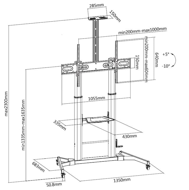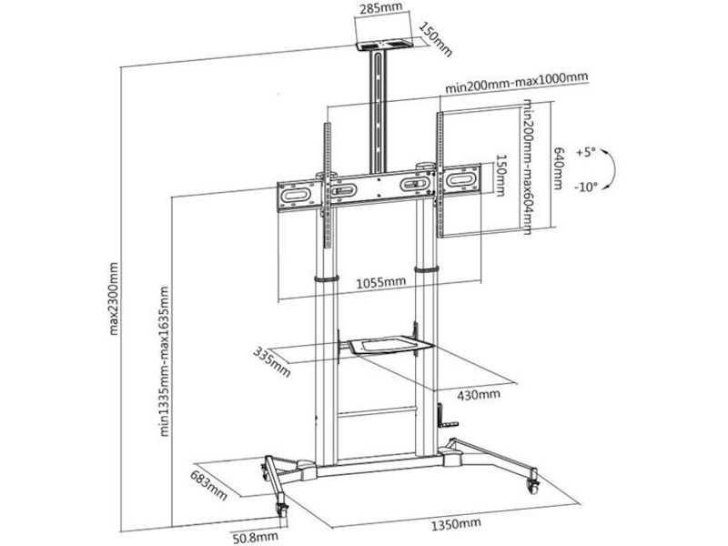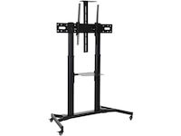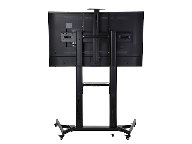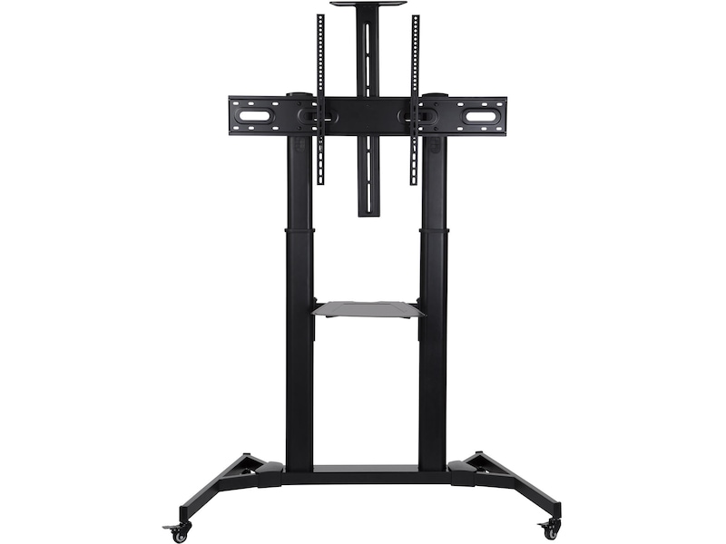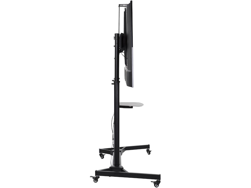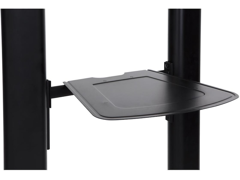 TV-vagnen levereras med två praktiska hyllor. Den ena är lämplig för en bärbar dator. Den andra är belägen ovanför plattskärmen och kan användas för en webbkamera. Du kan välja om du vill montera dessa hyllor. Skärmen du monterar kan vinklas för en optimal visningsvinkel. Den låter dig också montera en offentlig bildskärm i stående läge, samt platta och böjda plattskärmar. Med dess olika monteringsmöjligheter, höjd och hjulset, kan denna vagn ge dig stor flexibilitet och rörlighet.