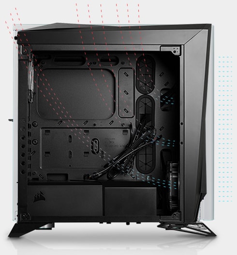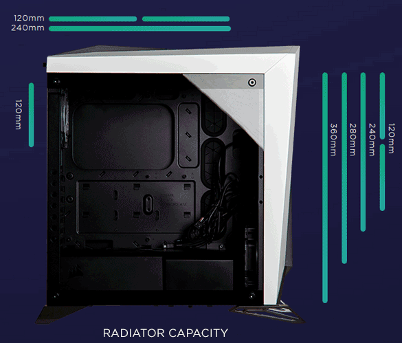 Stöder 280/360 mm radiator i frontpanel, Stöder 120 mm element bak, RGB-belysning, Direct Airflow Path-design, Stöder 240 mm element högst upp, Främre panel i tempererat glas |