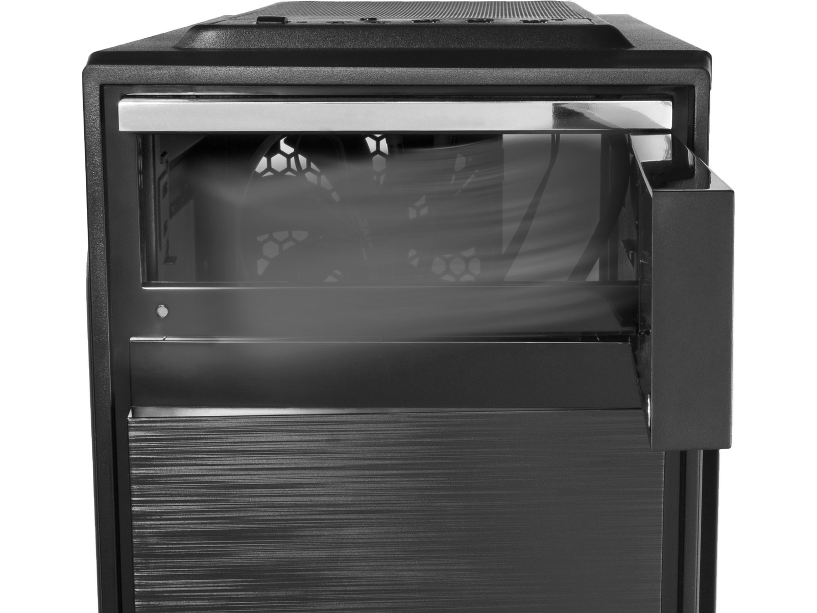 Stöder 120/240 mm radiator i frontpanel, Plats för 120 mm element i bakre panelen, PSU-höljeutskärning, Stöder 120/240 mm radiator högst upp |