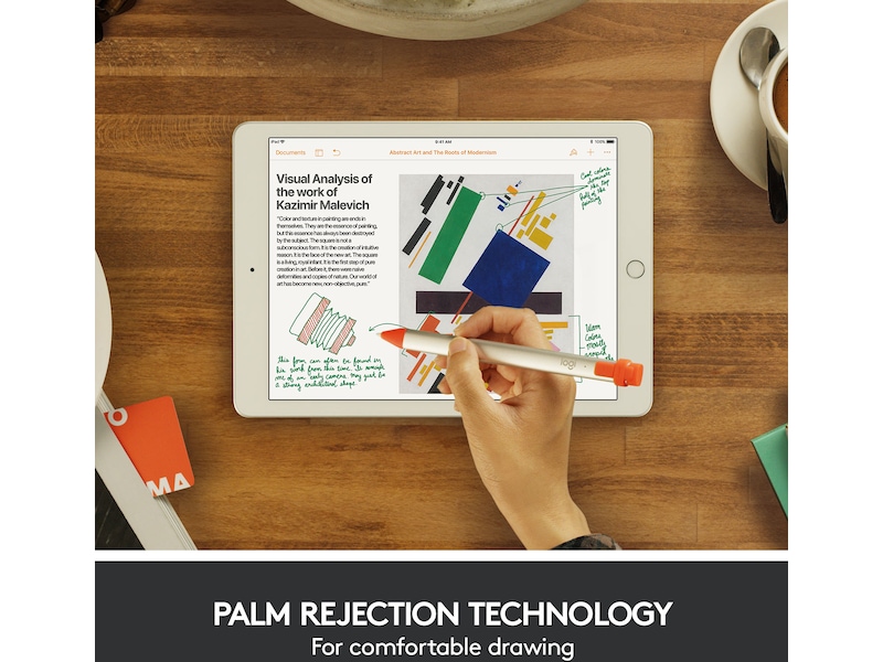 Sätt bara igång och vila handflatan på skärmen medan du skriver – iPad har stöd för bortstötningsteknik för handflata, för en naturlig handposition när du använder Logitech Crayon. Nu kan du sluta oroa dig för händerna och istället fokusera på handens uppgift.