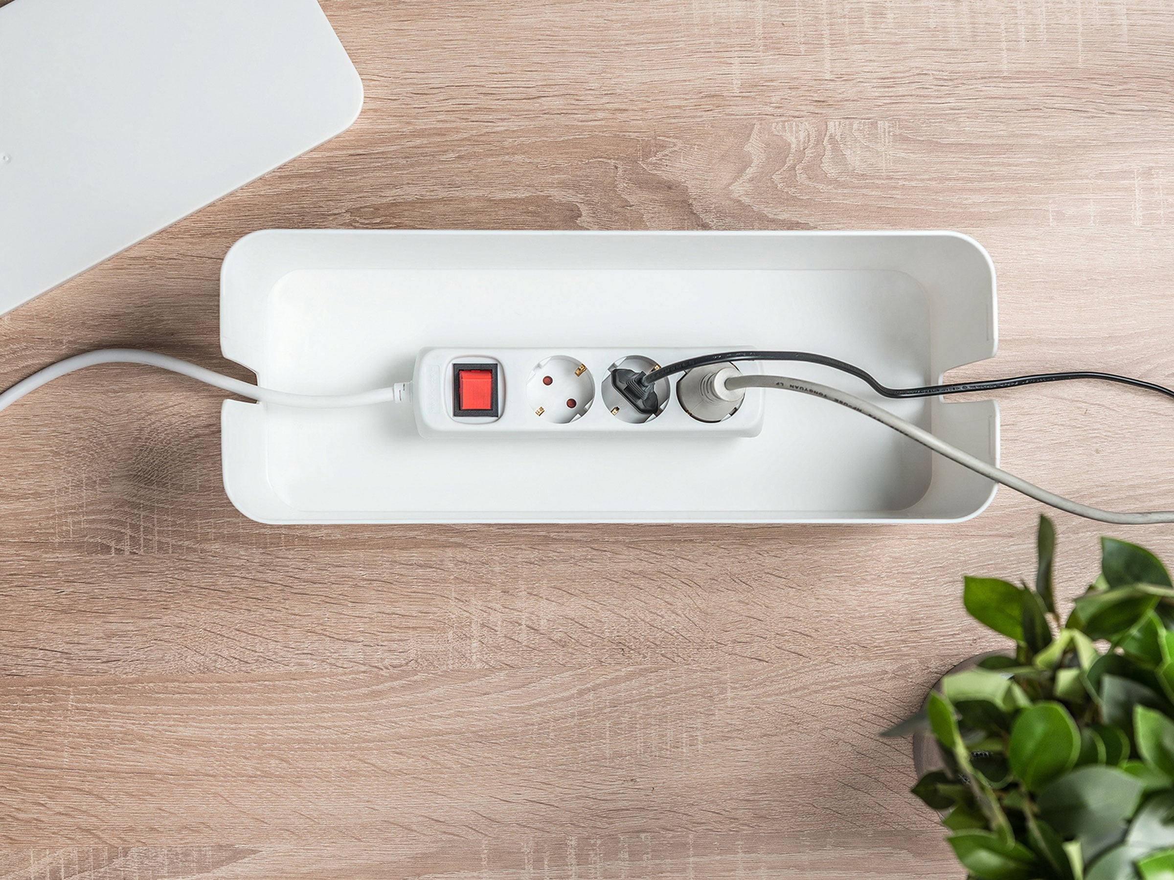 Har du en rörig hög med förlängningssladdar och kablar runt ditt skrivbord? Iiglos kabelhanteringsbox är en perfekt lösning för att hålla hemmet eller kontoret städat och organiserat! Lägg alla ledningar, förlängningssladdar och adaptrar i lådan och stäng locket för att dölja alla röriga kablar och skydda dem från damm och oavsiktligt vattenspill. Med sin minimalistiska design och vita finish passar den ihop med vilken inredning som helst. Få slut på kabelröran idag!