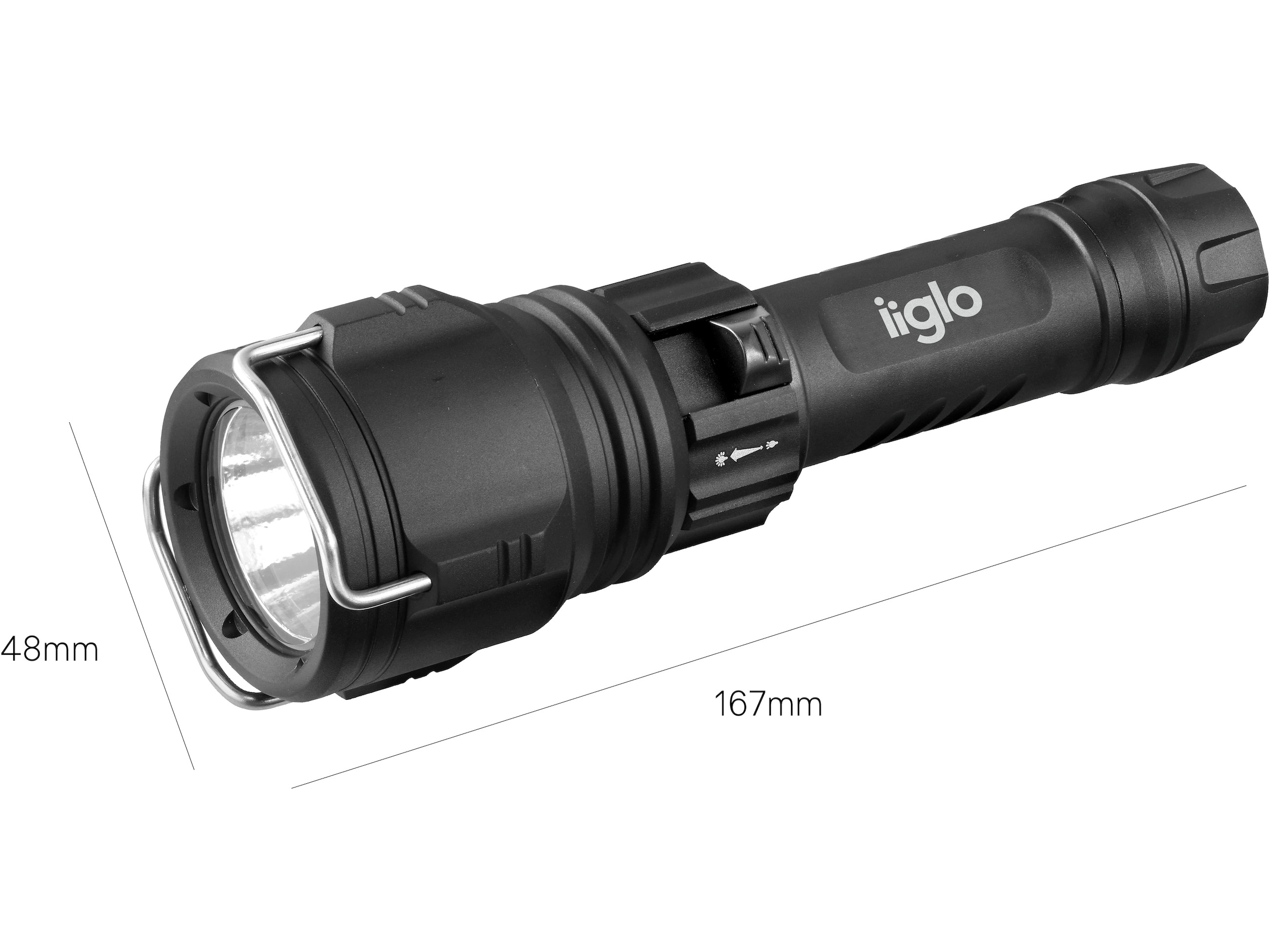 Iiglo LED-ficklampa 1000 lm är tillverkad i aluminium och har en matt svart färg. Den är 167 mm lång och väger 338 g inklusive det medföljande batteriet. Lampans bredd är 48 mm.