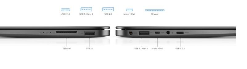 Micro-HDMI, USB 2.0, USB 3.0, USB-C 3.1 Gen 1, Telefon/mikrofonkombinationsjack |
