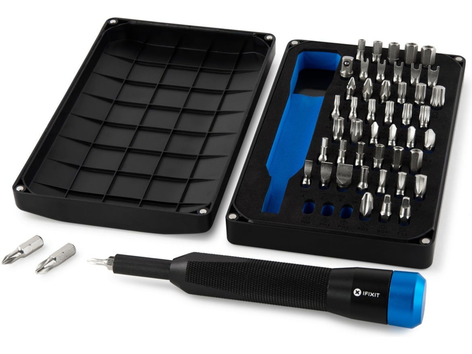 Alla våra nästa generations bitkits har omarbetats för maximal användning. Locket på bitkitet hålls på plats med magneter för att öka produktens livslängd (inga mer trasiga gångjärn eller hakar) och kan även monteras på baksidan av bitkithöljet för att hålla det ur vägen när du gör ditt arbete. Om du behöver hjälp med att hålla dina skruvar och delar organiserade, kan du använda lockets integrerade sorteringsfack.