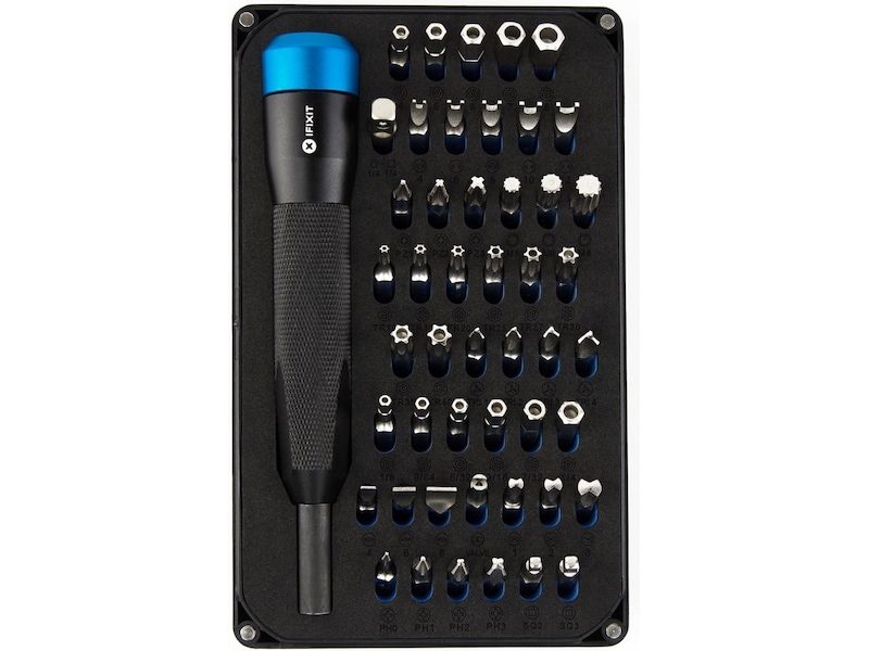 Mahi driverkit innehåller iFixi:s 1/4" aluminiumskruvmejselhandtag med magnetiskt bituttag, räfflat grepp, och svängbar topp - plus 48 driverbits.