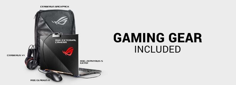Webbkamera, ROG Gladius II optisk mus, Strömadapter, ASUS ROG-ryggsäck, 3D ROG-skulptur, ASUS Cerberus-headset |