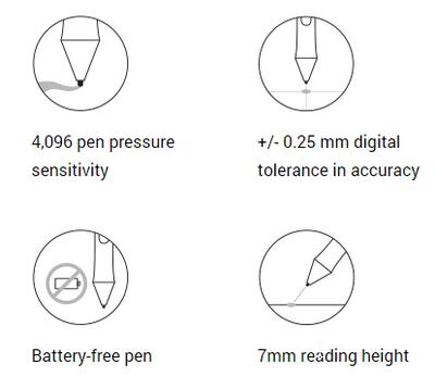 Det första du kommer att märka när du använder Wacom Intuos är hur naturlig den känns i handen. Genom EMR-tekniken (Electro-Magnetic Resonance), ger den batterifria pennan med 4 096 nivåer av tryckkänslighet en naturlig tecknarupplevelse som kan hålla på lika länge som du gör. Med dess ergonomiska design och låga vikt känns den bekväm i handen samt erbjuder både precision och styrning.