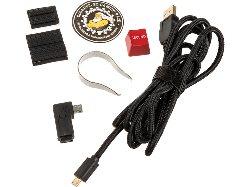 Glorious klistermärke, tangentborttagare, specialtillverkad switch-borttagare och standard ESC-tangenter.