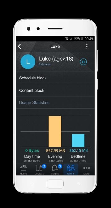 Se varje familjemedlems internetaktivitet på en tydlig grafisk instrumentpanel, som visar den mest aktiva tiden och vilken typ av innehåll de tittar på. Du kan gruppera enheter som tillhör dina barn för att se aggregerade data och tillämpa planerade blocktider och innehållsfilter med bara några klick.
