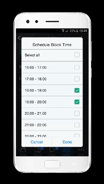 Reservera värdefull tid för familjen eller hjälp dina barn att utveckla ett ansvarsfullt beteende, genom att välja schemalagda tidsperioder där du blockerar tillgången till internet på specifika enheter.