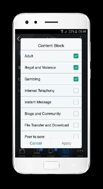 Blockera specifika kategorier av mobila appar och webbplatser, och tillämpa dessa inställningar för alla enheter som tillhör enskilda familjemedlemmar. Den avancerade filtreringen integrerar en Trend Micro Deep Packet Inspection (DPI) motor för att filtrera inte bara efter webbadress men också efter själva internetpaketen, vilket innebär att den inte bara filtrerar innehållet i en webbläsare, men också i mobila appar på dina enheter.