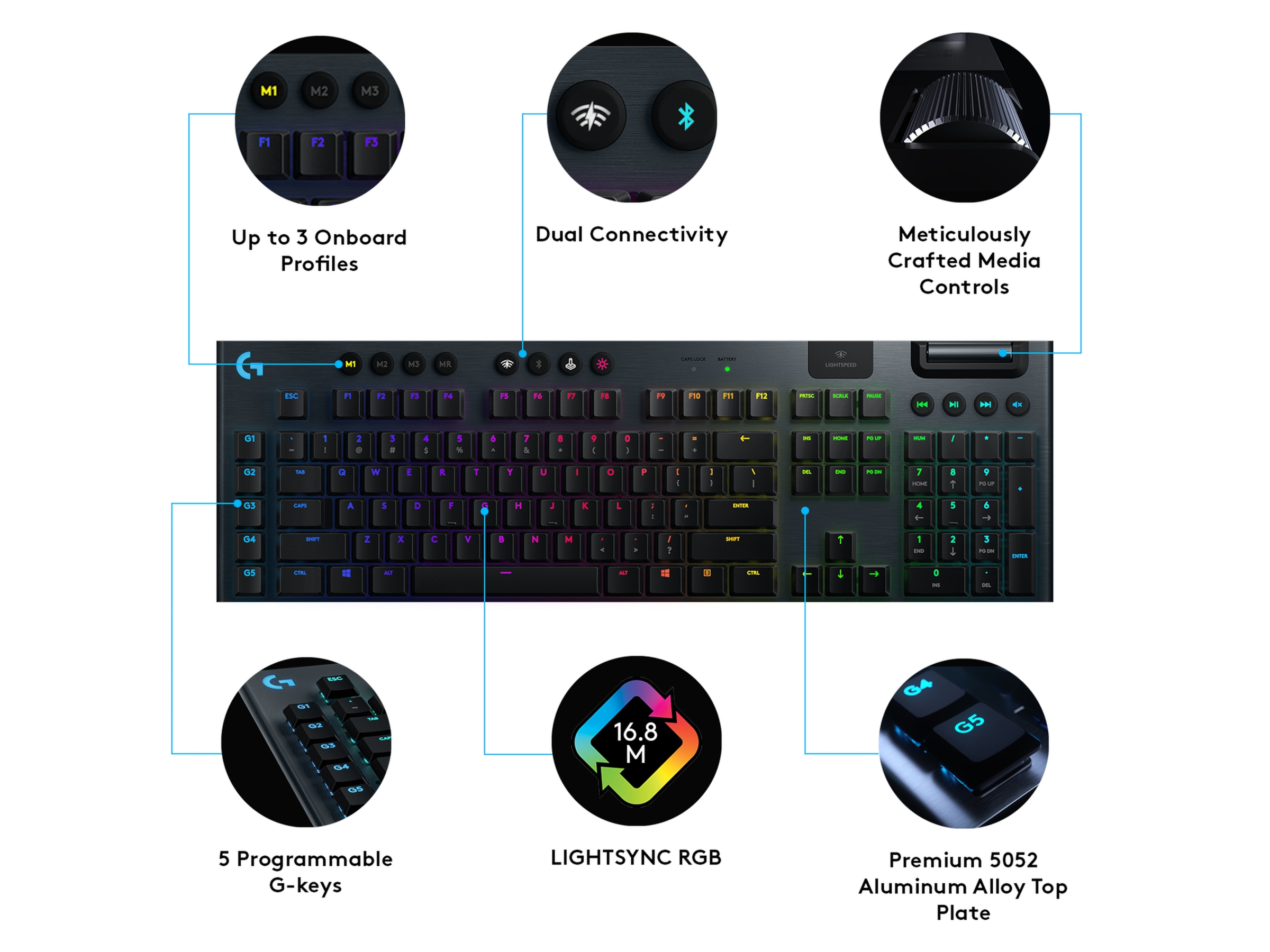 G915 är en ny kategori av trådlösa mekaniska speltangentbord med tre val av diskreta GL-brytare och 1 ms trådlös LIGHTSPEED i proffsklass. Levererar 30 timmars oavbrutet spelande på en fulladdning.* Helt anpassningsbar och avancerad LIGHTSYNC RGB-teknik för varje tangent för att synkronisera belysningen till innehållet.