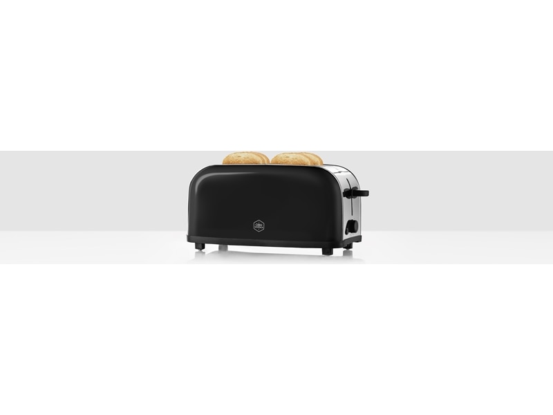 Denna snygga brödrost i svart förgyller din frukoststund. Brödrosten har kapacitet för 4 skivor och tack vare den smidiga high rise-funktionen slipper du bränna fingrarna när du ska ta upp ditt bröd. Automatisk centrering av brödskivorna, stoppknapp samt steglös inställning av önskad rostningsgrad. Perfekt för den större familjen eller för smörgåsälskare!