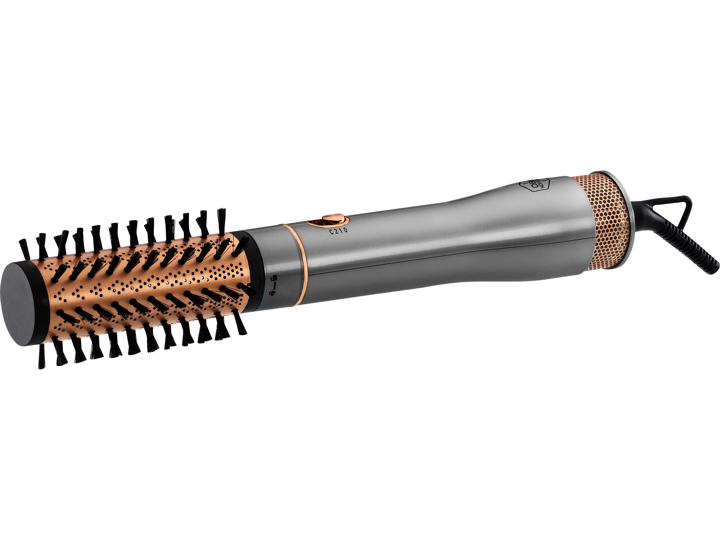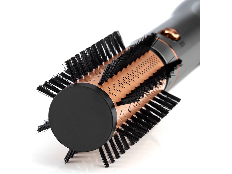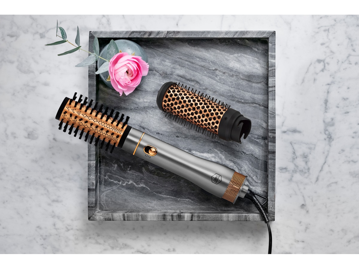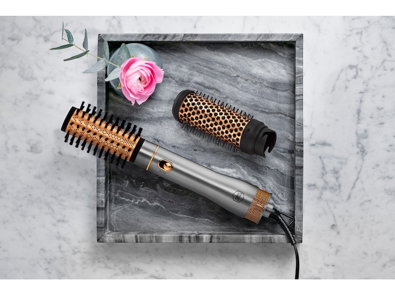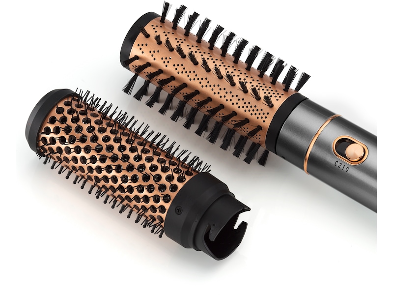 Varmluftsborsten har 3 olika värmeinställningar och 1 kallluftsfunktion, samt 2 olika borsthuvuden: en volymborste (Ø 30 mm) och en värmeborste (Ø 35 mm).