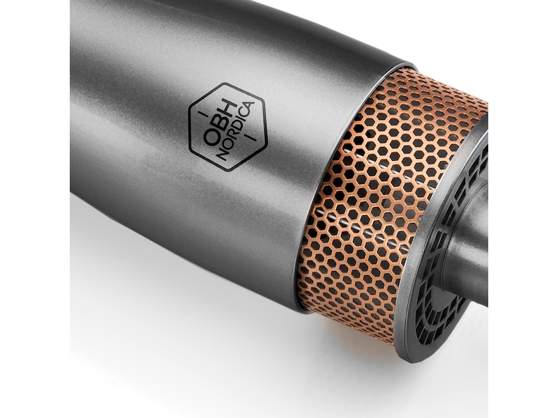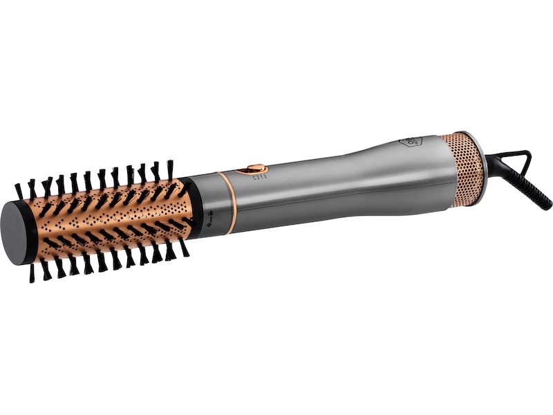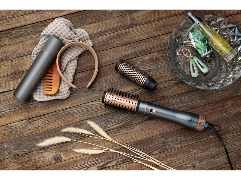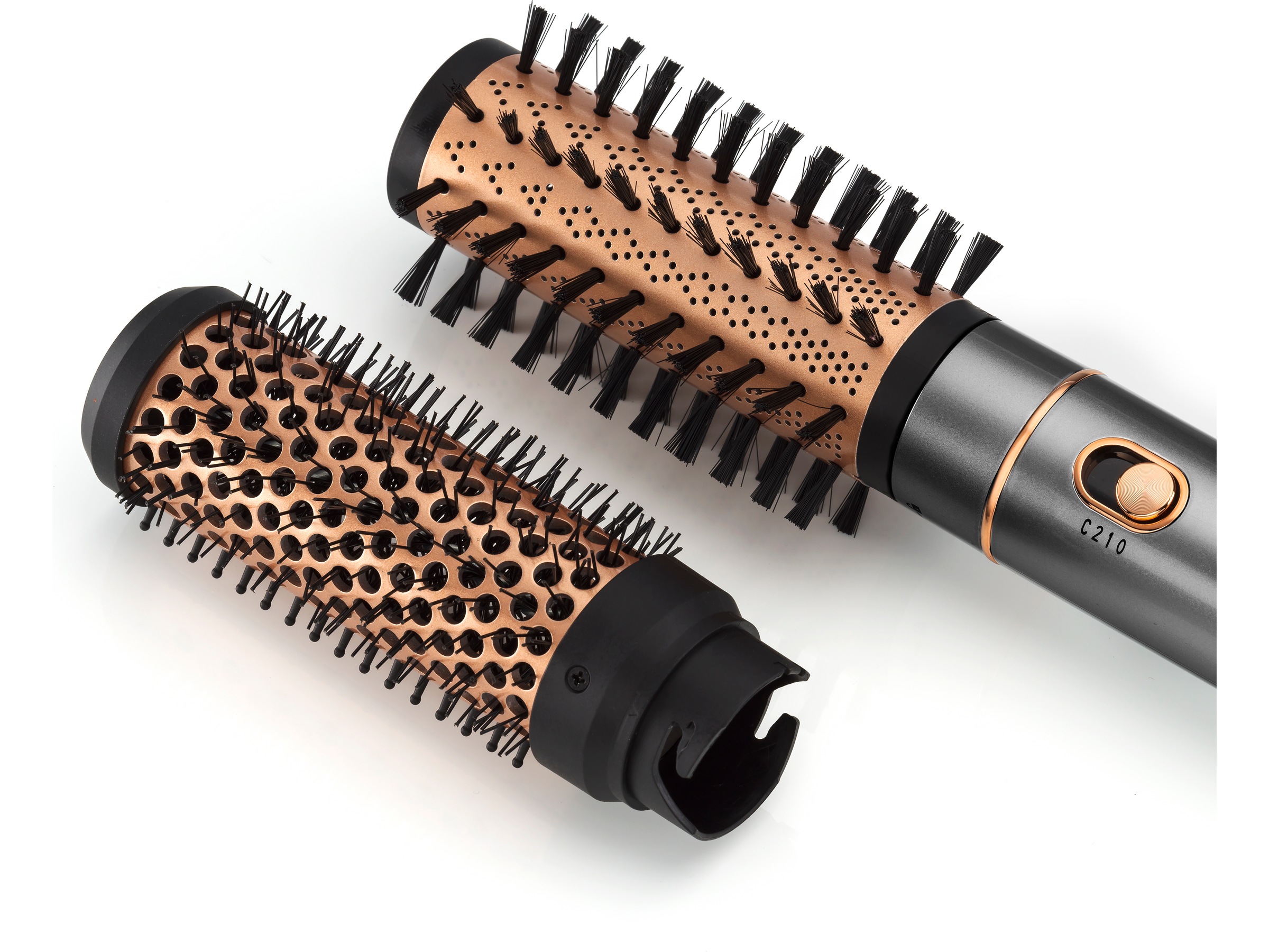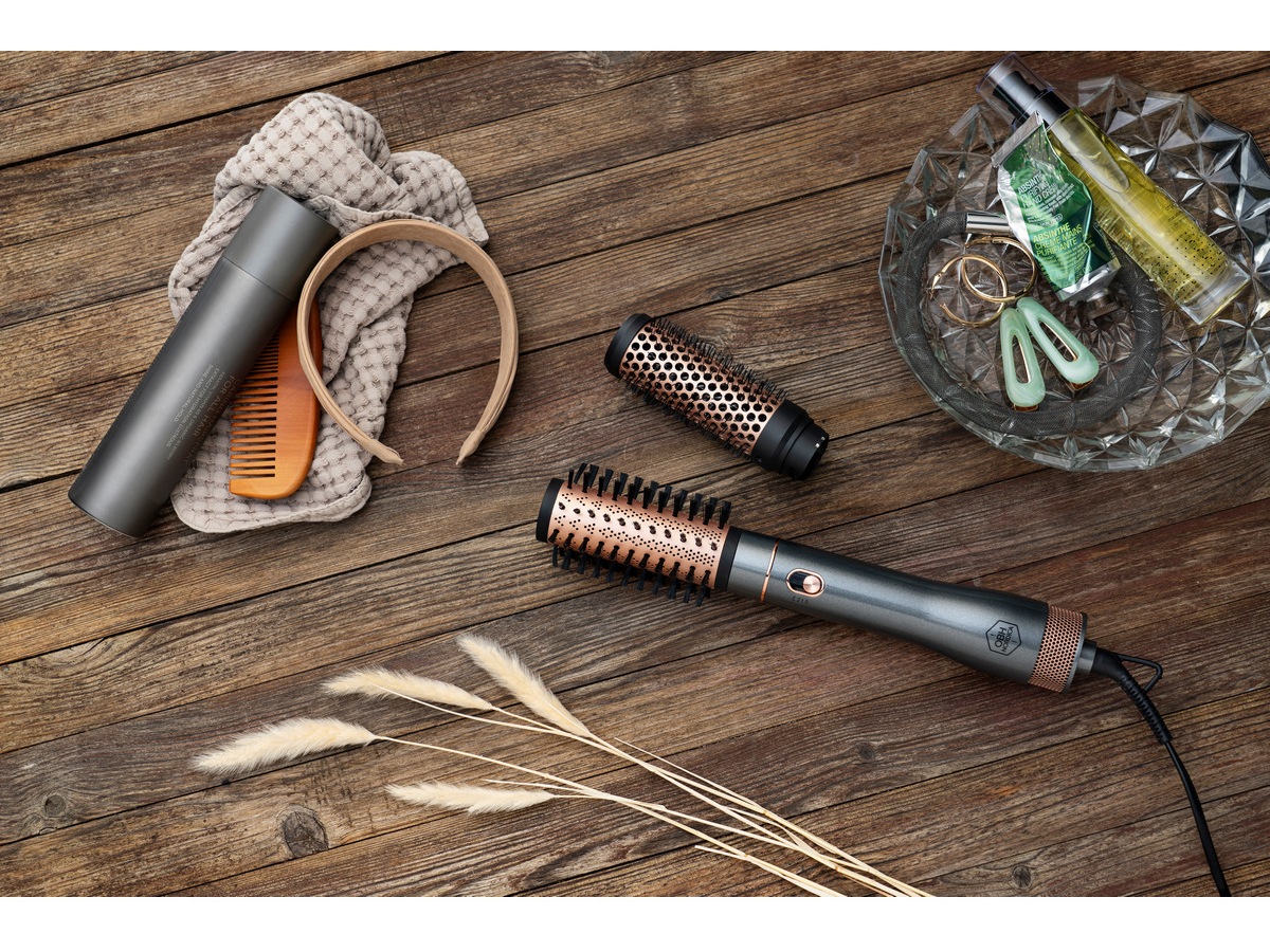 Varmluftsborsten har 3 olika värmeinställningar och 1 kallluftsfunktion, samt 2 olika borsthuvuden: en volymborste (Ø 30 mm) och en värmeborste (Ø 35 mm).