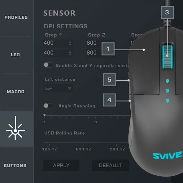 Ladda ner programvaran Svive Alpha - med en enkel anpassning får du exakt de inställningar som passar din spelstil. Justera sensorinställningar som DPI och spara olika profiler så att du snabbt kan växla mellan dem medan du spelar dina favoritspel. Konfigurera musens 6 programmerbara knappar och tilldela dem de makroinställningar du väljer.