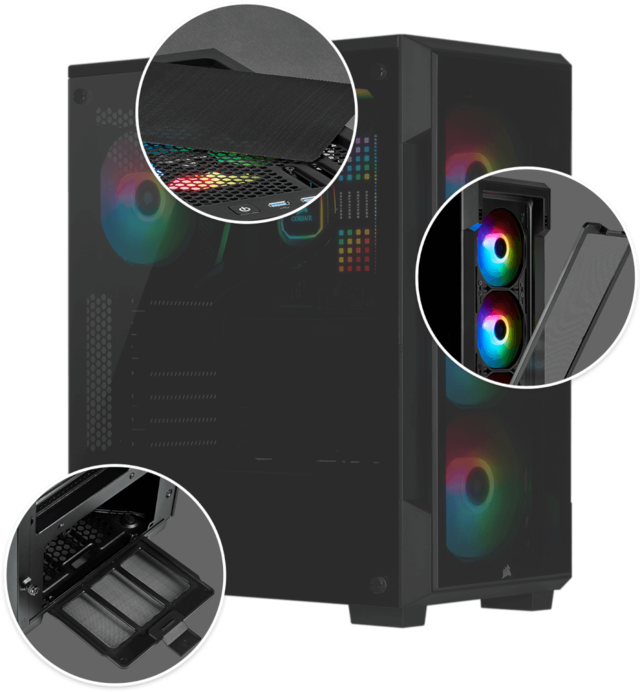 Främre dammfilter, PSU-dammfilter, Dammfilter till överdel, Stöder 120 mm element bak, Stöder 280/360 mm radiator i frontpanel, Stöder 240 mm element högst upp |