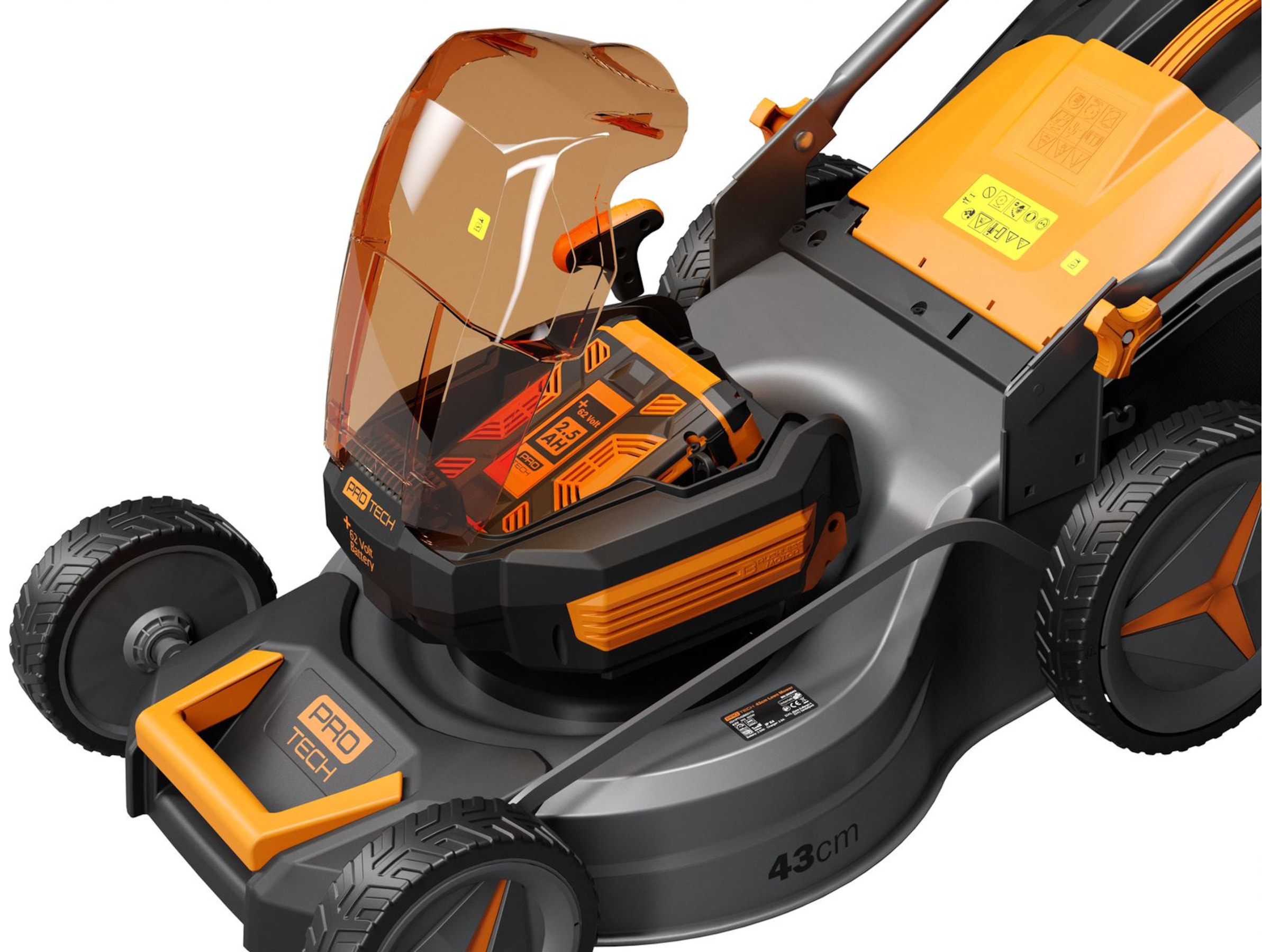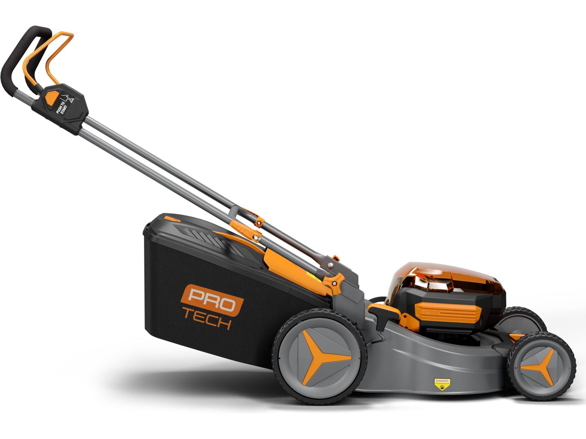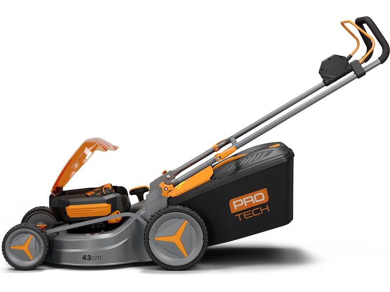 62-volts batteridriven gräsklippare med borstlös motor för bättre prestanda, längre körtid och lägre ljudnivå. Klippbredd 43 cm och möjlighet att klippa sex olika höjder. Det robusta stålhöljet och den borstlösa motorn har låg ljudnivå och effektiv klippning. Du kan välja mellan två olika skärmetoder; med uppsamlingsbehållare eller eko-klippläge. Du kan justera klipphöjden centralt (6 olika lägen) och gräsklipparen är lätt att förvara eftersom du kan fälla ner handtaget och ställa klippenheten i vertikalt läge. Det medföljande +62-volts 2,5Ah-batteriet kan enkelt användas för andra redskap i Protech +62-voltsserien. Här ingår också en batteriladdare i leveransomfattningen. Maskinen passar för gräsmattor som är mindre än 200 m2.