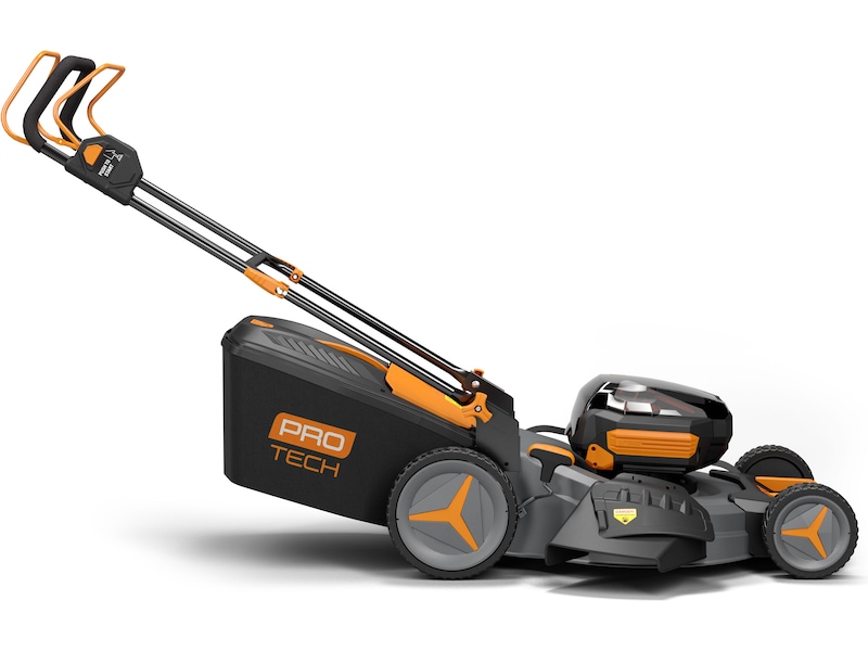 Du kan välja mellan tre olika klippmetoder; med uppsamlingsbehållare, sidoutlopp eller eko-klippläge. Du kan justera klipphöjden centralt (6 olika lägen) och gräsklipparen är lätt att förvara eftersom du kan fälla ner handtaget och ställa klippenheten i vertikalt läge. Det medföljande +62 volt 5,0 Ah-batteriet kan även användas för andra redskap i Protech +62-voltsserien. Leveransomfattningen inkluderar också en batteriladdare. Maskinen passar till gräsmattor som är större än >200 m2.