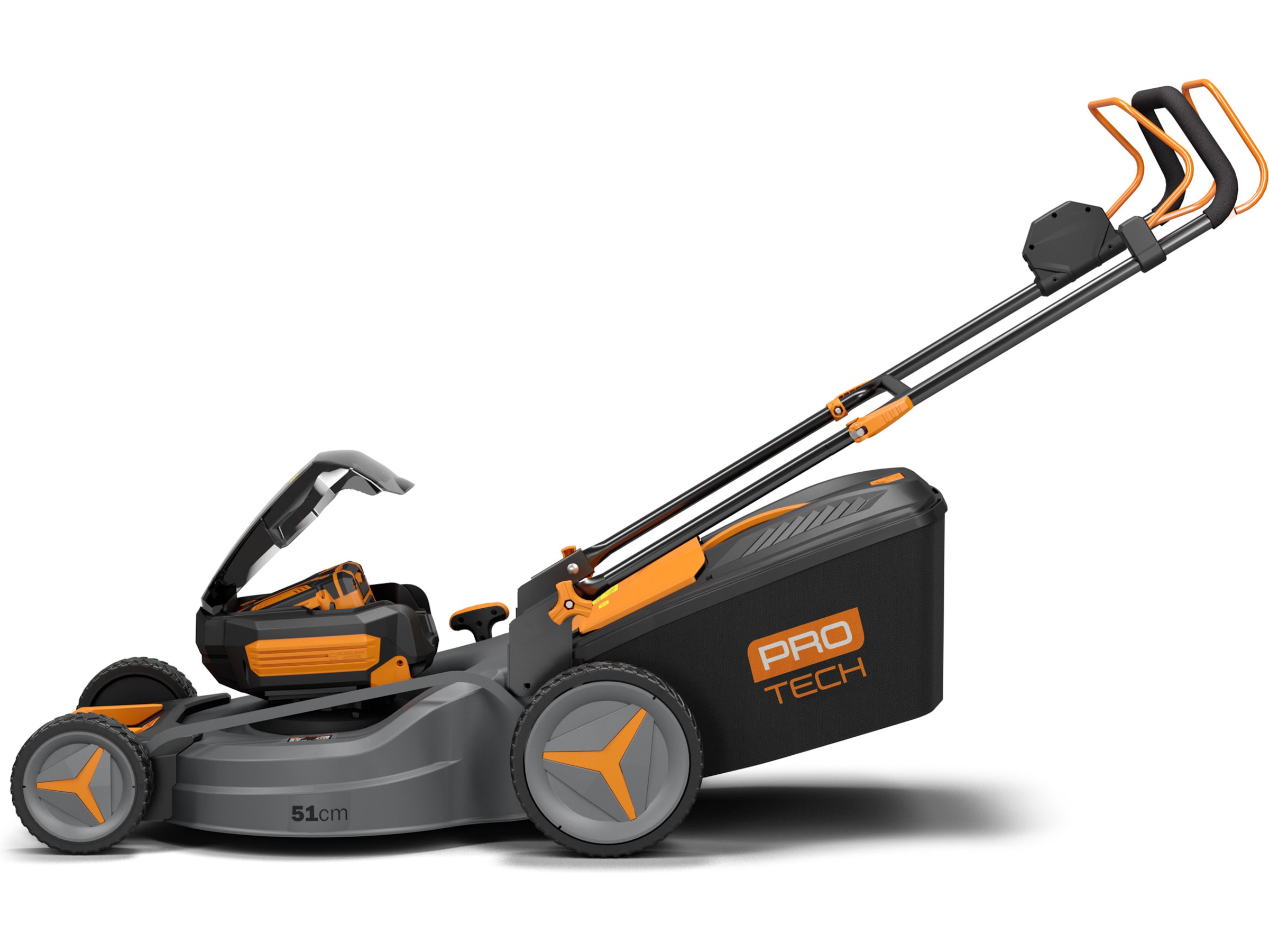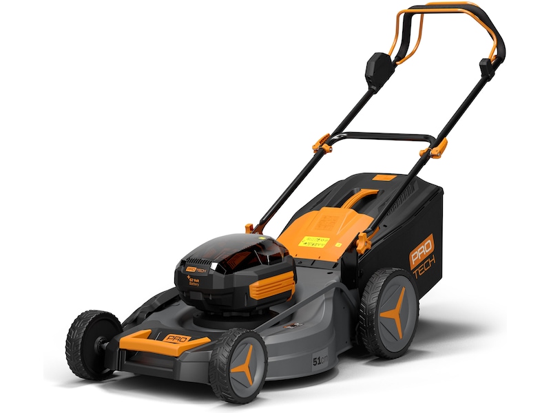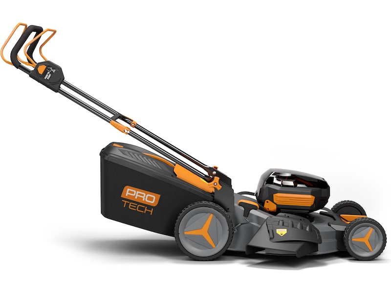 62-volts batteridriven gräsklippare med borstlös motor för bättre prestanda, längre körtid och lägre ljudnivå. Skärbredd 51 cm och möjlighet att klippa 6 olika höjder. Protech-gräsklipparen är självgående och drivs med bakhjulen. Det robusta stålhöljet och den borstlösa motorn har låg ljudnivå och effektiv klippning. Du kan välja mellan tre olika klippmetoder; med uppsamlingsbehållare, sidoutlopp eller eko-klippläge. Du kan justera klipphöjden centralt (6 olika lägen) och gräsklipparen är lätt att förvara eftersom du kan fälla ner handtaget och ställa klippenheten i vertikalt läge. Det medföljande +62 volt 5,0 Ah-batteriet kan även användas för andra redskap i Protech +62-voltsserien. Leveransomfattningen inkluderar också en batteriladdare. Maskinen passar till gräsmattor som är större än >200 m2.