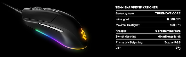 Gamingmusen Rival 3 har den bästa prestandan i sitt segment tack vare den optiska TrueMove Core gamingsensorn i turneringsklass, specialkonstruerad i samarbete med den branschledande tillverkaren PixArt. Hyperhållbara material garanterar musens livslängd, med klassning för 60 miljoner klick i en lätt konstruktion. Det omdesignade RGB-systemet ger kristallklar dynamisk belysning åt varje SteelSeries-mus, och får Rival 3 att sticka ut både när det gäller stil och prestanda.