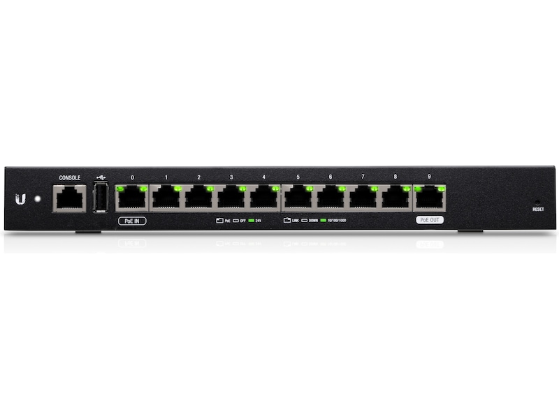 Gigabit-router med en inbyggd Layer 2-switch, (10) Gigabit RJ45-portar, en PoE-ingång och PoE-passthrough-port.