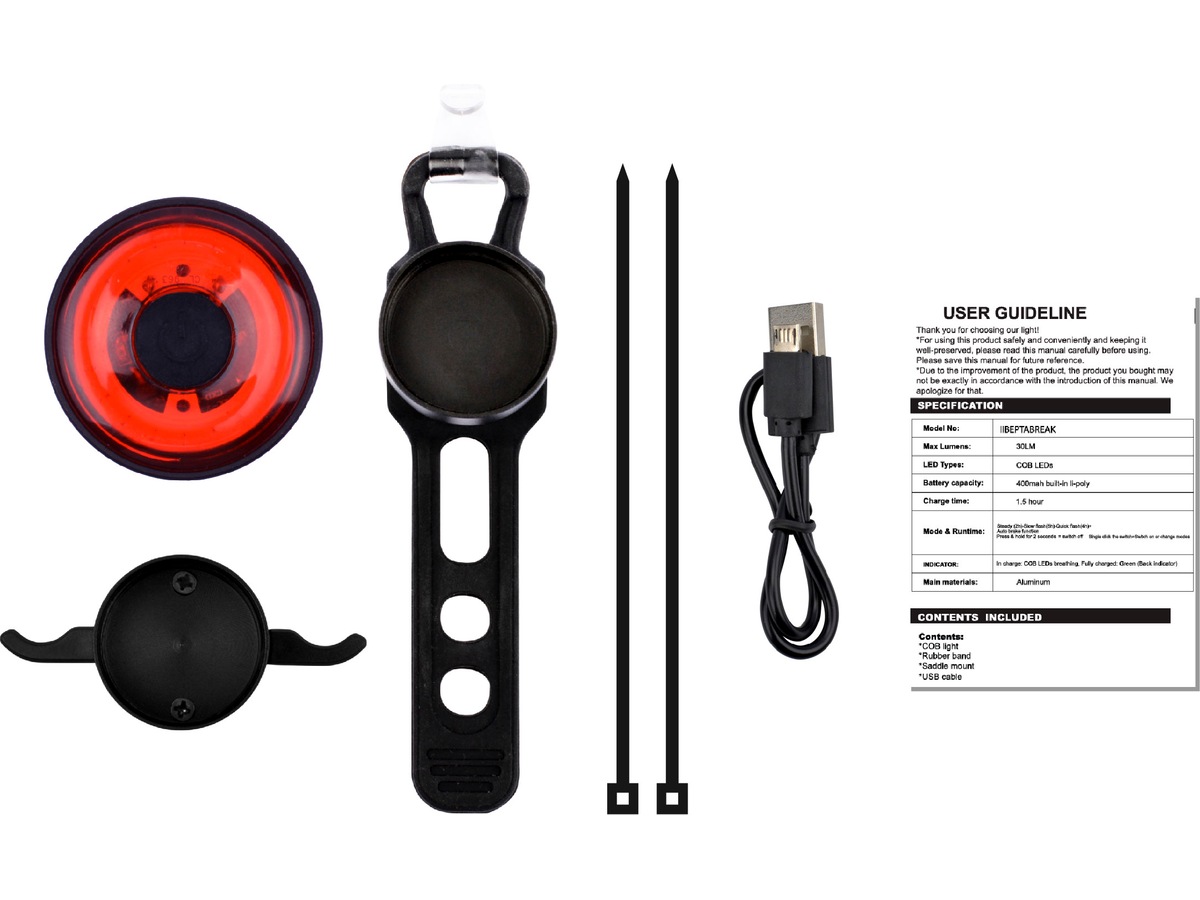 Denna lampa med rött COB LED-lys och en ljusstyrka på 30 lumen ger god synlighet bakifrån. Välj mellan 4 olika ljuslägen: 3 lägen för snabbt ljus och 1 läge för blinkning. Full styrka ger ljus i ca 2 h, och snabb blinkning ger ljus i 4 h.