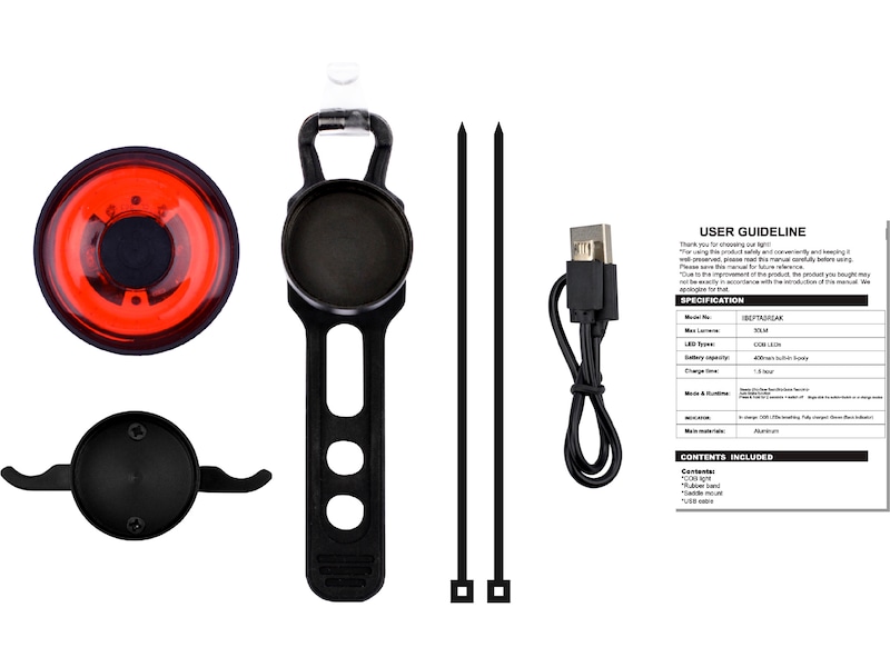 Denna lampa med rött COB LED-lys och en ljusstyrka på 30 lumen ger god synlighet bakifrån. Välj mellan 4 olika ljuslägen: 3 lägen för snabbt ljus och 1 läge för blinkning. Full styrka ger ljus i ca 2 h, och snabb blinkning ger ljus i 4 h.