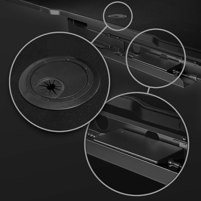Kablarna breder ut sig och skrivbordet ger ett rörigt intryck, men Svive Altair gamingskrivbord hjälper dig att hålla ordning. Musmattan är i ett stycke och du kan välja hur du vill dra kablarna, eftersom det finns tre olika kabelhål. Dessutom håller den medföljande kabelskenan ordning på alla dina kablar ned till närmaste vägguttag.