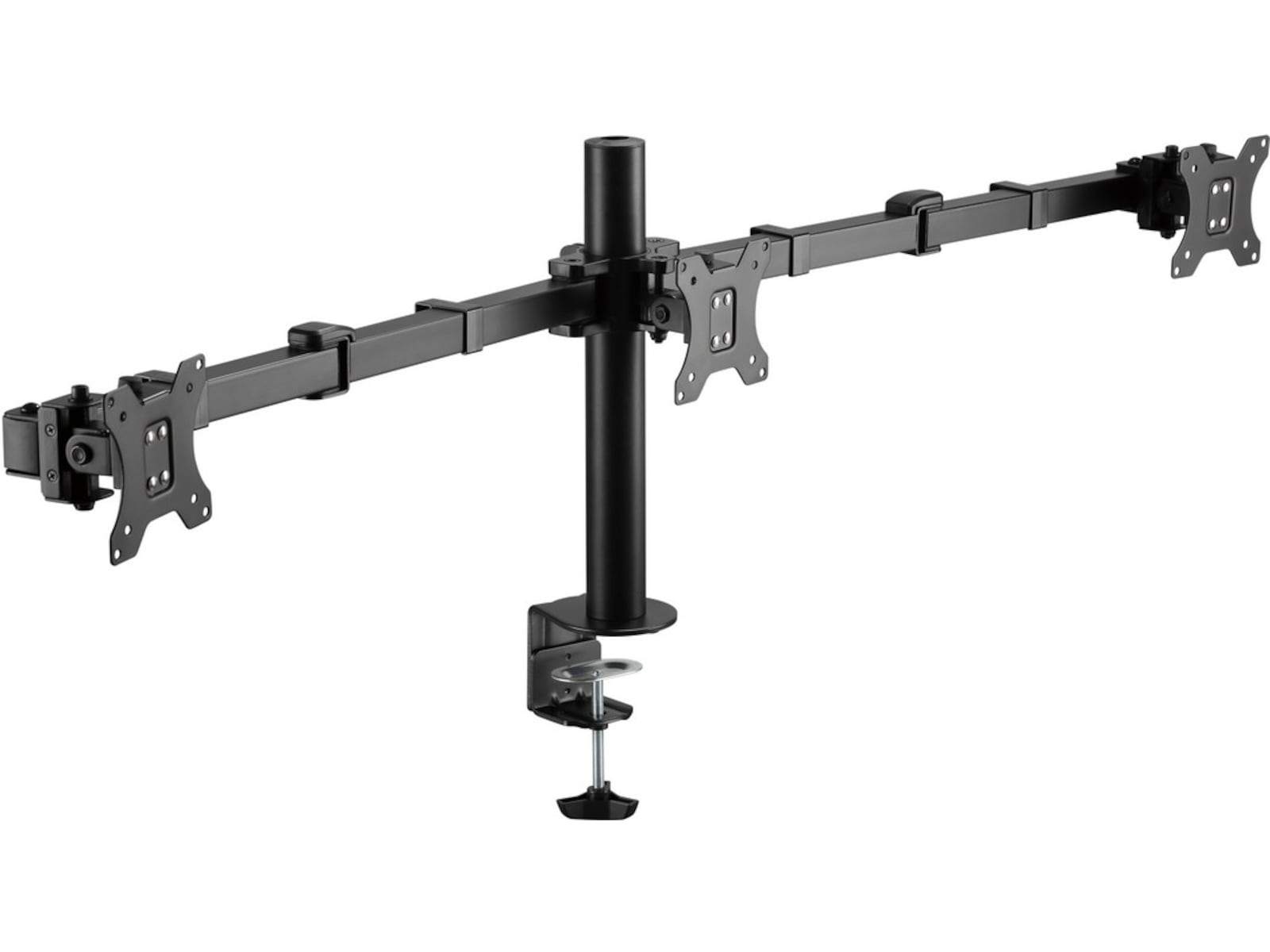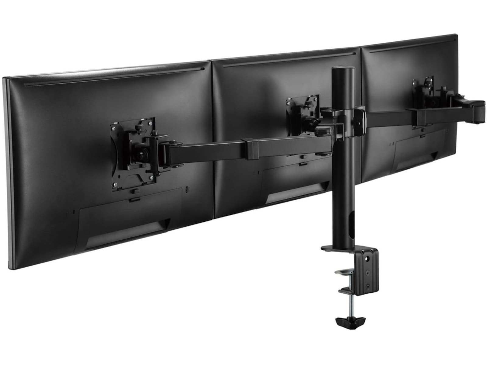 Få mer plats på ditt skrivbord med iiglo Triple Monitorarm, som låter dig montera upp till tre skärmar! Justera deras höjd, bredd, lutning och svängning enkelt!