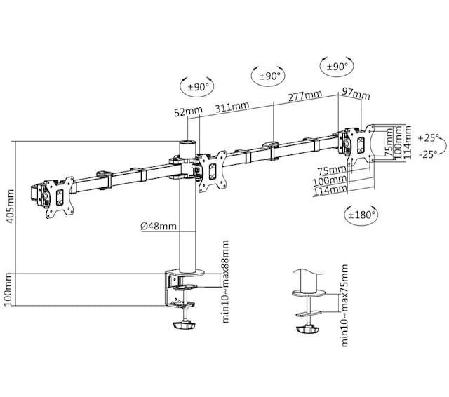 Denna bildskärmsarm levereras med en avtagbar VESA-platta med 360-graders rotation. Kombinerat med den trippel-svängbara armen ger detta dig otaliga möjliga positioner för din skärm.